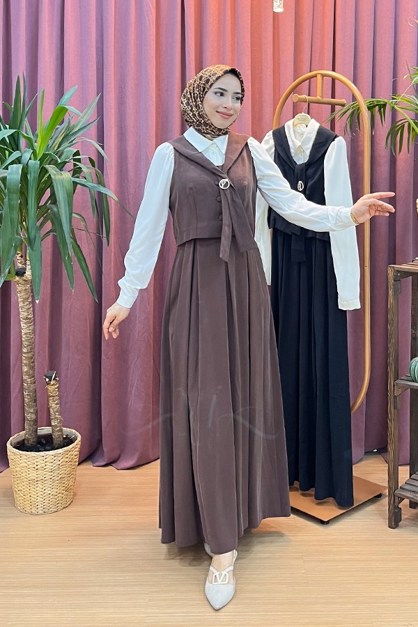 Broş detaylı bağlama yaka, klasik çizgilere modern bir dokunuş katıyor.