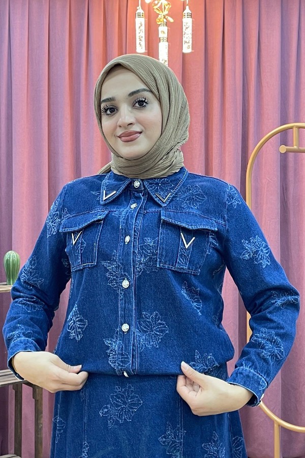 Düğmeli Kot kendinden desenli Cep Detaylı Kot Takım