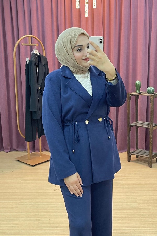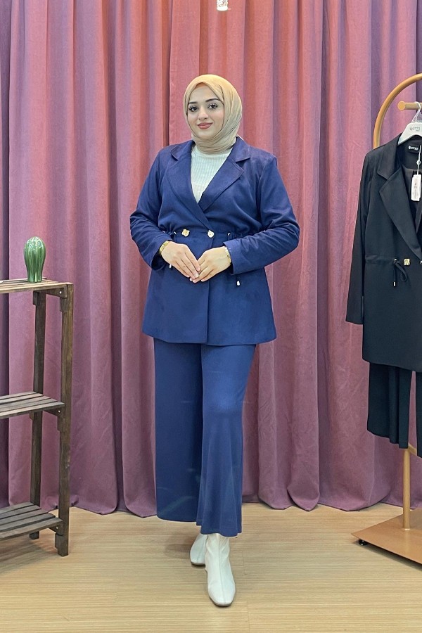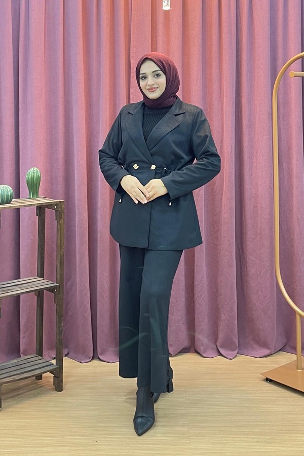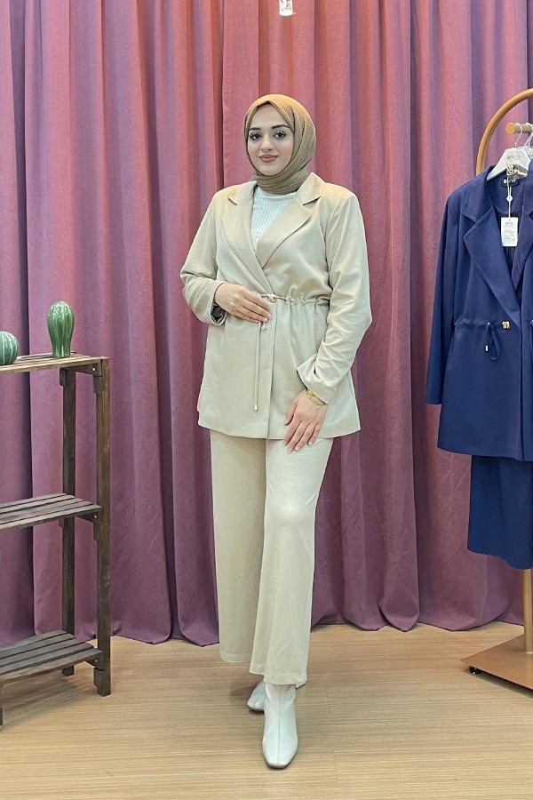 Ceket ve pantolondan oluşan iki parçalı tesettür takımdır. Ceket bel kısmı ayarlanabilir bağcık detayına sahip olup düz kesim pantolon ile kombinlenmiştir. Takım, orta kalınlıkta örme kupra kumaştan üretilmiştir. Günlük ve yarı resmî kullanım için uygundur.